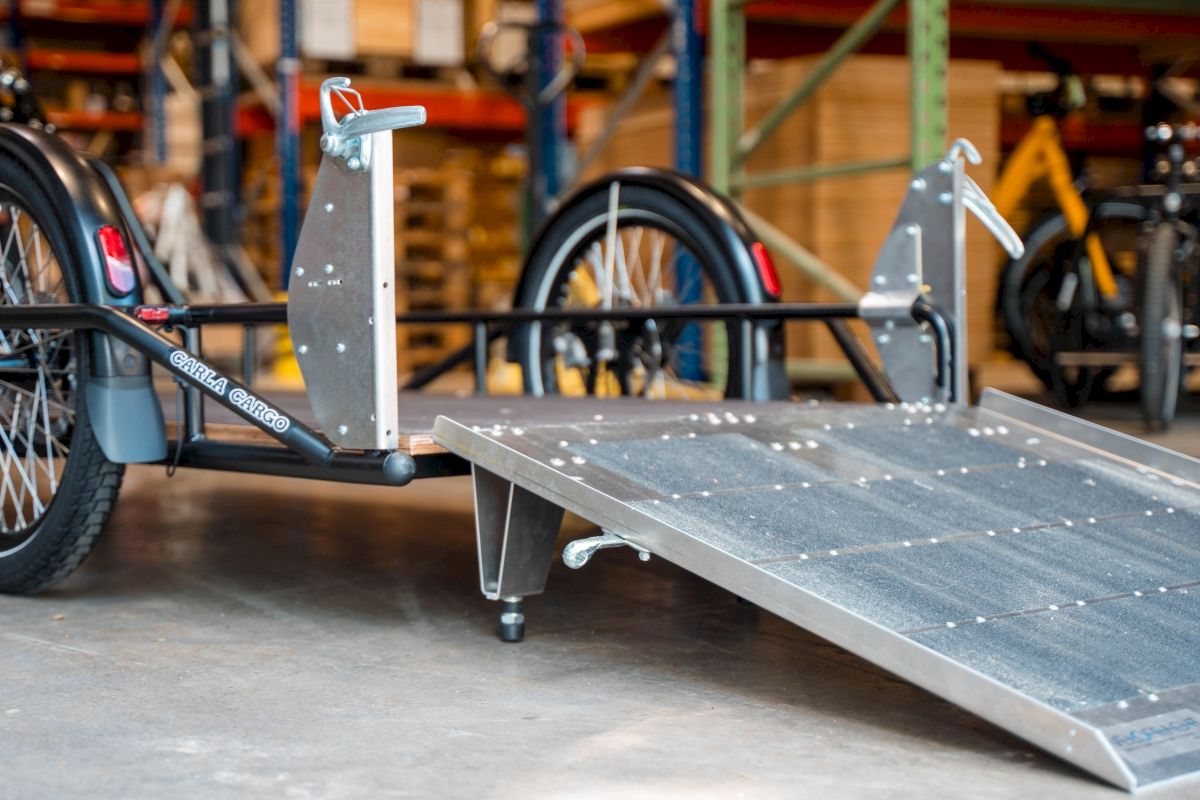 Hohl das Maximale aus deiner CARLA raus mit einer stabilen Rampe, mit welcher Du vom Rasenmäher bis zum rollbaren Werkzeugschrank alles in Sekundenschnelle laden kannst. Die Rampe ist mit zahlreichen Aufbauten von Velofracht und unserer Bodenplatten light mit integrierten Airlineschienen kompatibel. Durch die integrierten Stützen ist ein sicheres Belaufen der Rampe kein Problem und ermöglicht Dir ein schnelles und unkompliziertes Beladen auf "Rollen". Die Rampe gibt es für alle CARLA und eCARLA Modelle außer CARLA mini.