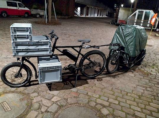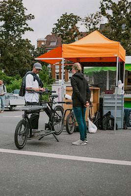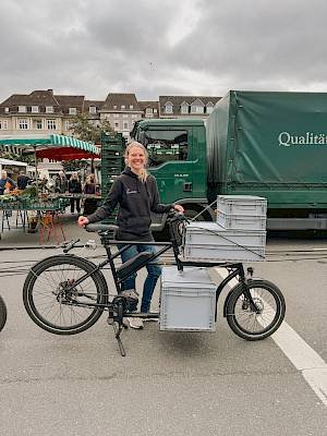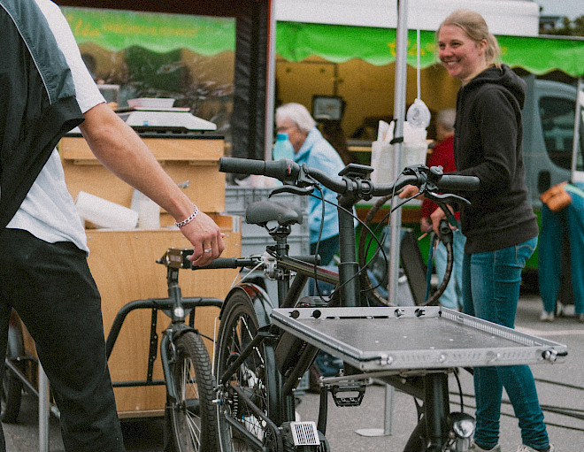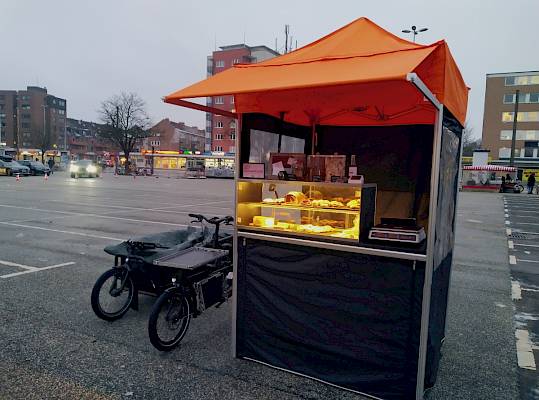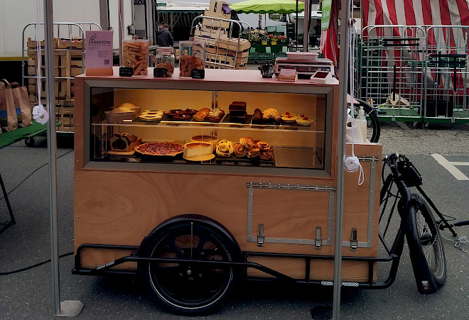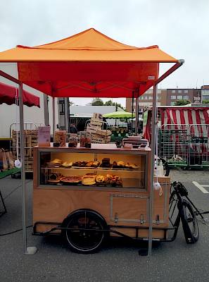 Svenja ne comprend pas tout à fait l'engouement pour ce qu'elle fait. On lui demande sans cesse si elle y arrive et pourquoi elle commercialise ses pâtisseries sucrées à vélo. Pour elle, c'est pourtant très clair. Elle économise des frais, est beaucoup plus flexible et rapide lors de l'approvisionnement du marché et attire naturellement l'attention avec une telle structure qu'elle a construite et développée elle-même et, accessoirement, elle vend ce qu'elle maîtrise le mieux : des pâtisseries et des petits gâteaux. Nous pensons que Svenja n'est pas seulement une super pâtissière, mais aussi un exemple d'utopie vécue. Nous te remercions d'avoir opté si naturellement pour un tel attelage et la prochaine visite du marché chez toi à Kiel est assurée ;-)